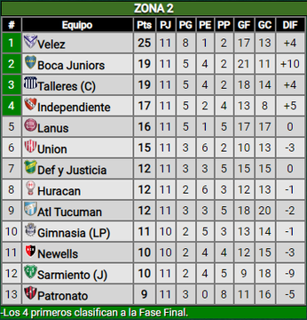 En la Zona B, Vélez (25) dio vuelta su encuentro ante Lanús y es el primer equipo que se aseguró una plaza en la fase final del certamen. Incluso, parece muy difícil que se le pueda escapar el primer puesto del grupo. Boca (19), por su parte, venció 2 a 0 a Huracán y es escolta. Talleres (19) se impuso a Atlético Tucumán y, por diferencia de goles, ocupa el tercer puesto. Independiente (17), que igualó sin goles frente a Unión de Santa Fe, está cuarto. Lanús (16) y el Tatengue (15) están expectantes.