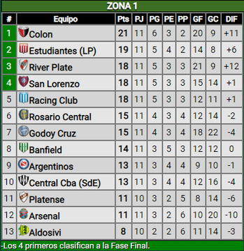 El Pincha rescató un triunfo muy valioso en condición de visitante y, con 19 unidades, se posiciona como único escolta de Colón de Santa Fe (21). Los dirigidos por Marcelo Gallardo, por su parte, tienen 18 puntos y comparten la misma línea que San Lorenzo y Racing. Por diferencia de goles, River está tercero, el Ciclón cuarto y la Academia queda relegada al quinto puesto. El Canalla y Godoy Cruz (15) no se resignan y se ilusionan con dar el golpe en la recta final.
