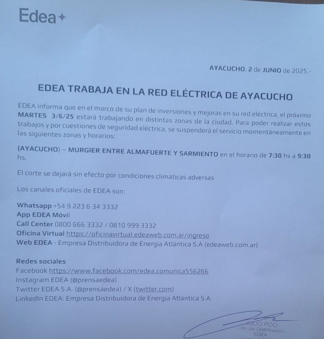 Corte de energía eléctrica pautado para este martes 2 junio, 2025 Redacción destacados, Locales, locales DIA 0 Minolta DSC Desde EDEA anunciaron un corte de energía programado para este martes 3 de Junio, que se dará en Murgier entre Almafuerte y Sarmiento, entre las 7:30 a 9:30 horas, a fin de realizar los operarios trabajos de mantenimiento. X