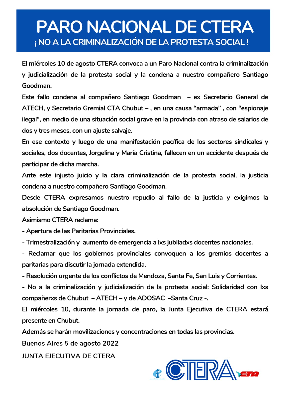 CTERA anuncia un Paro Nacional – Para este miércoles 10 de Agosto 8 agosto, 2022 Pablo Tusq destacados, Locales, locales DIA 0 X