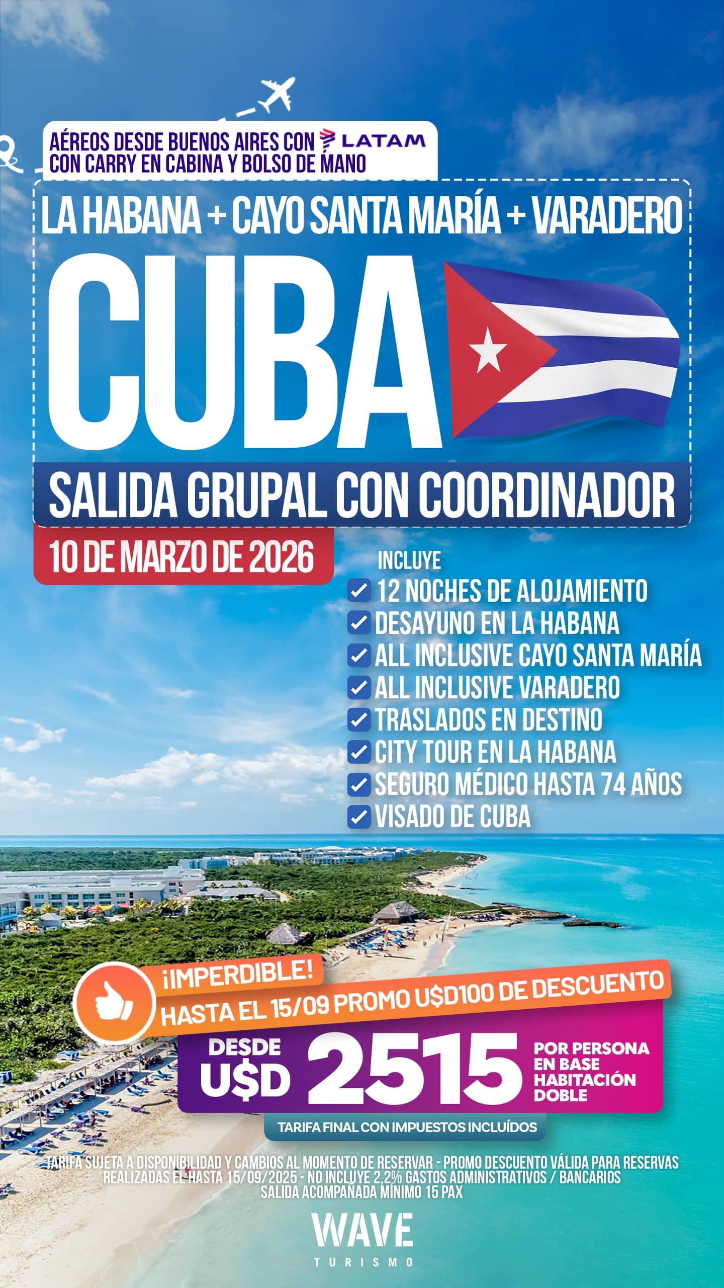 Marita Aranda y WAVE Viajes tienen tu destino para el 2026, único, increíble. Un total de 12 noches en Cuba, que incluye La Habana, Cayo Santa María y Varadero, All Inclusive. Salida grupal con coordinador el 10 de Marzo. Consultá con Marita en Murgier 1084 o al celular 2494 57 8431.