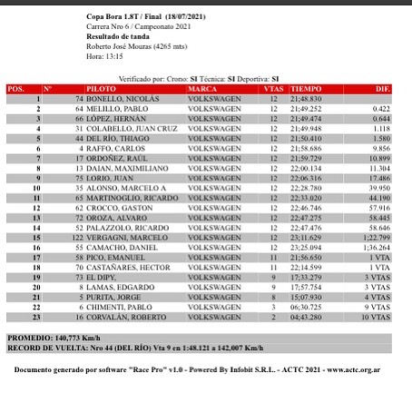 La competencia fue ganada por el debutante Nicolás Bonello, ocupando el 2do lugar del podio Pablo Melillo y el 3ero Hernán López. La categoría mantiene un buen parque automotor, que siempre supera las 20 máquinas y siempre son transmitidas por la TV Pública.