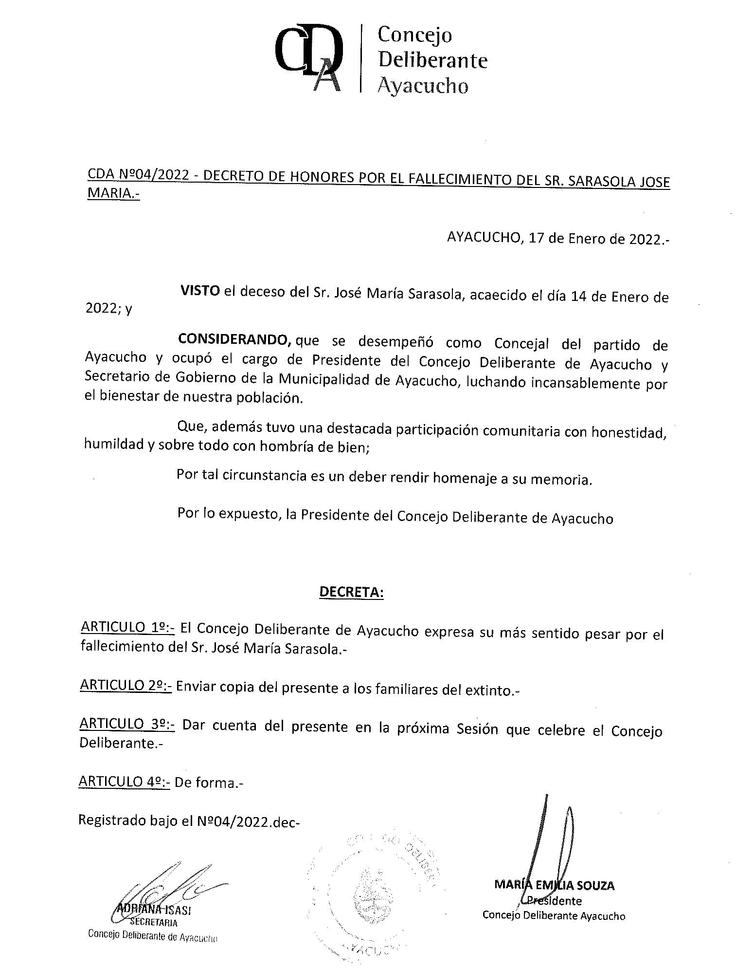 Decreto de Honores del HCD por el fallecimiento de José María Sarasola 18 enero, 2022 Pablo Tusq destacados, Locales, locales DIA 0 X