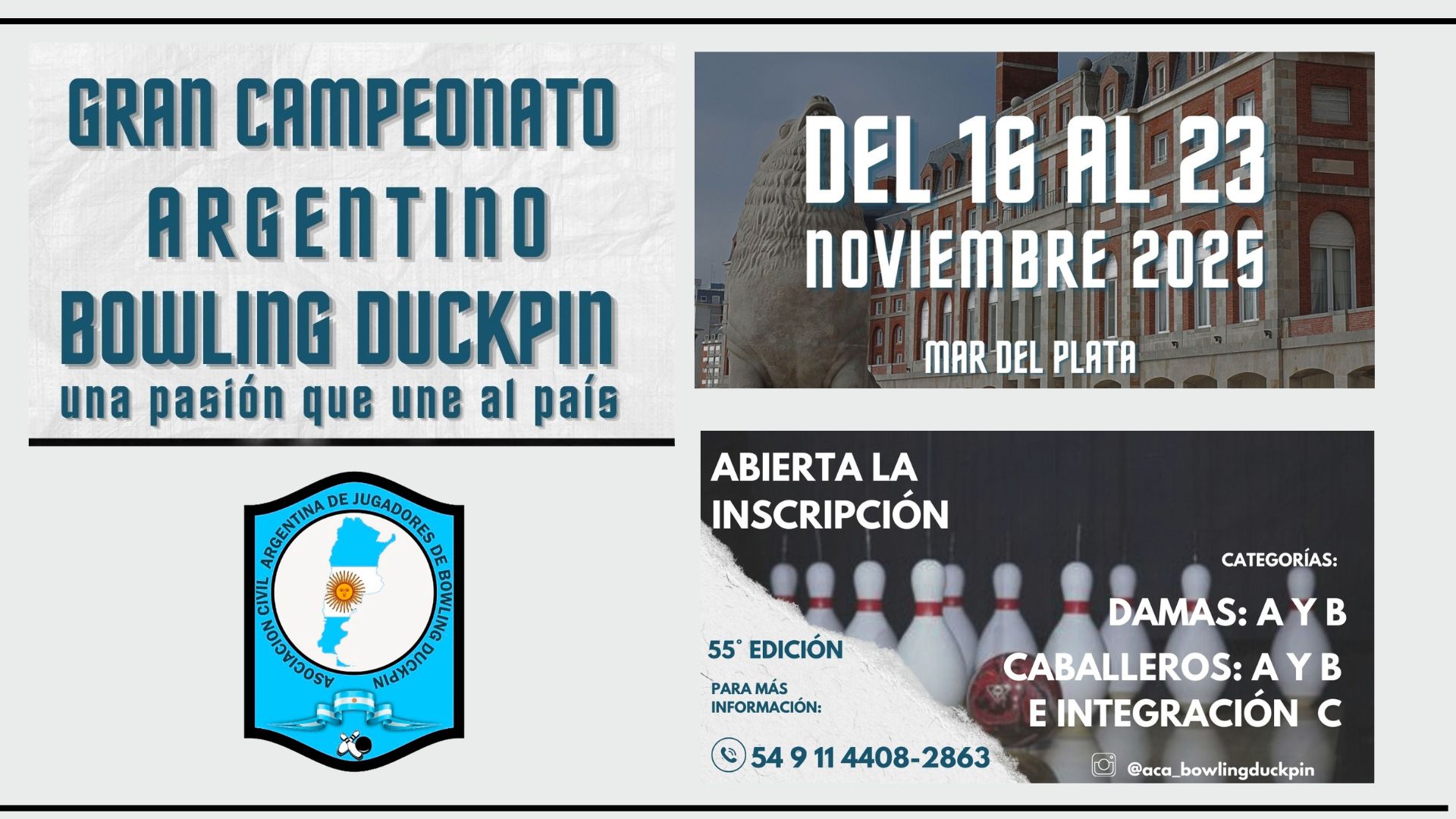 Del 16 al 23 de noviembre, Mar del Plata será sede de la 55.ª edición del torneo más importante de Bowling Duckpin en Argentina. Con más de 200 participantes de todas las provincias y equipos ya confirmados de Catamarca, Mendoza, Mar del Plata, Olavarría, Miramar, San Justo, Rufino, Bahía Blanca, Ranchos, La Pampa, Trenque Lauquen, Juan N Fernández, Villa Gesell y Lobería, el campeonato promete ser una verdadera fiesta del deporte y la unión federal.