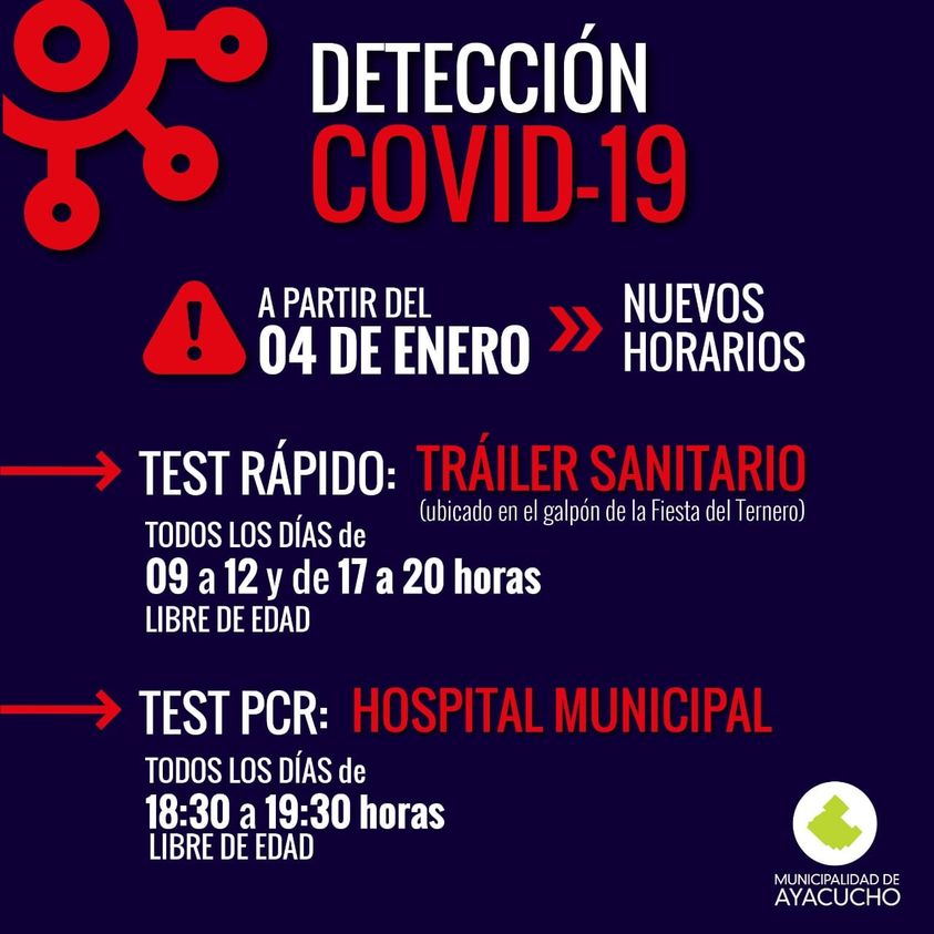 Desde hoy martes 4 de enero y ante el crecimiento en los contagios por Covid, se amplían los días y horarios en donde se realizarán los testeos. En el tráiler sanitarios ubicado en el Galpón de la Fiesta del Ternero, será todos los días de 9 a 12 y de 17 a 20 horas, siendo libre de edad.