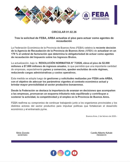 Desde la Cámara de Comercio de Ayacucho, informaron que la Federación Económica de la Provincia de Buenos Aires (FEBA), celebra la reciente decisión de ARBA, de actualizar en un 179% el umbral de facturación que determina la obligatoriedad de actuar como agentes de recaudación sobre los Ingresos Brutos.