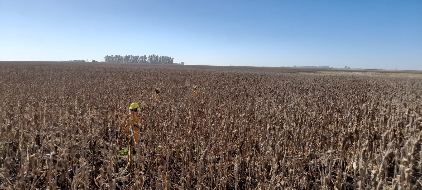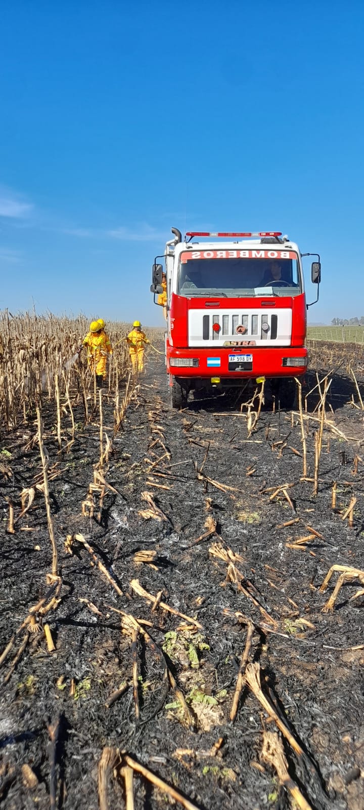Arribados al mismo se constato que se trataba efectivamente del incendio sobre un lote de maíz en pie y rastrojo del mismo cultivo, se procedió a asegurar la escena para posteriormente realizar tareas de extinción y enfriamiento sobre la zona afectada.