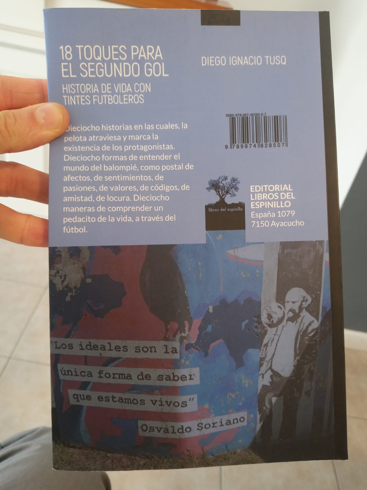 D. I. T; “Hola Pablo y Sergio, ¿Cómo están? Contento de tener la posibilidad de llegar a la gente por medio de ustedes. La posibilidad del primer libro se dio en el 2014 cuando mediante el proyecto de ley libros editados en Ayacucho –LEA-, tuve la posibilidad de tener mi primer libro de cuentos de fútbol que fue presentado en 2015 y lo de este libro será por otras historias que fueron siendo escritas que estos últimos años hasta poder ser plasmada en esto que se llama; 18 toques para el segundo gol…”