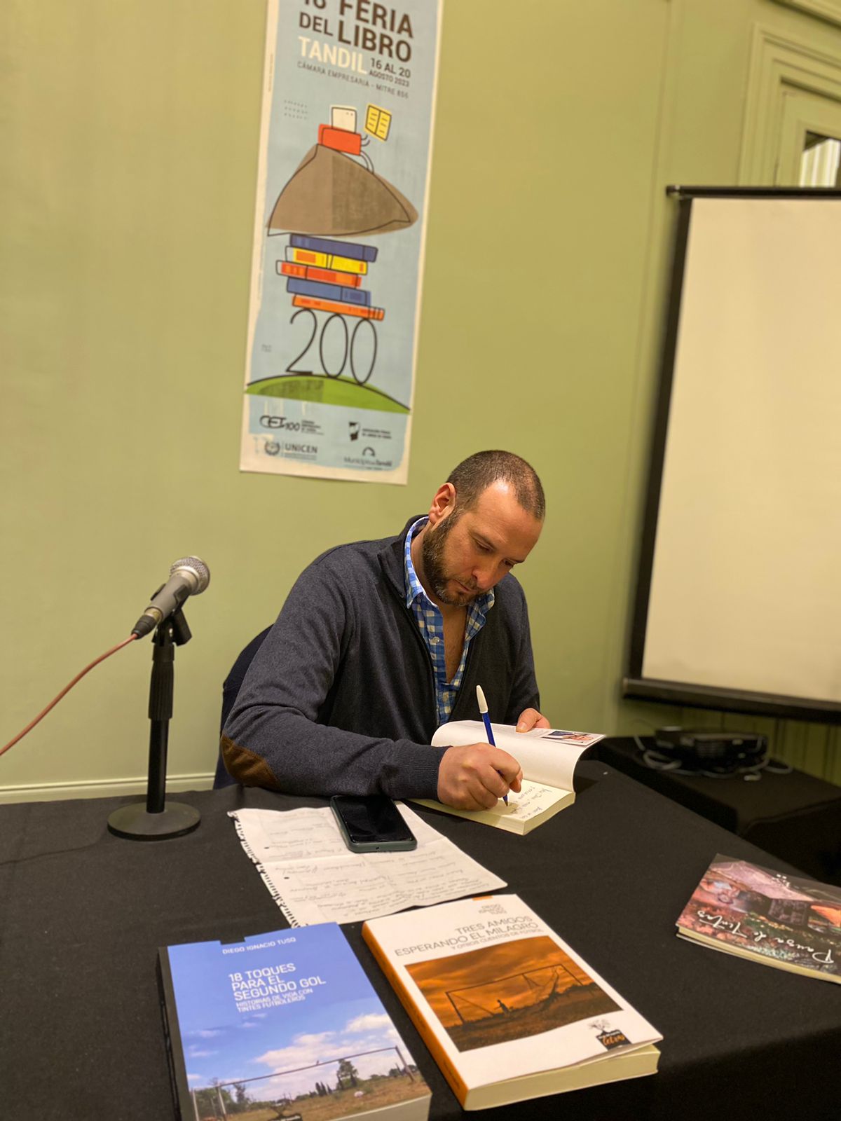 En redes, el escritor ayacuchense radicado en tandil por razones laborales señaló; «Feria del Libro 2023 de Tandil. Muy linda charla la de anoche en la cual estuvimos conversando de «Tres amigos esperando el milagro y otros cuentos de fútbol». ¡Muchas gracias a todos los presentes, en especial a @anacaliyuri por la presentación y a @alfalibtandil por la invitación!»