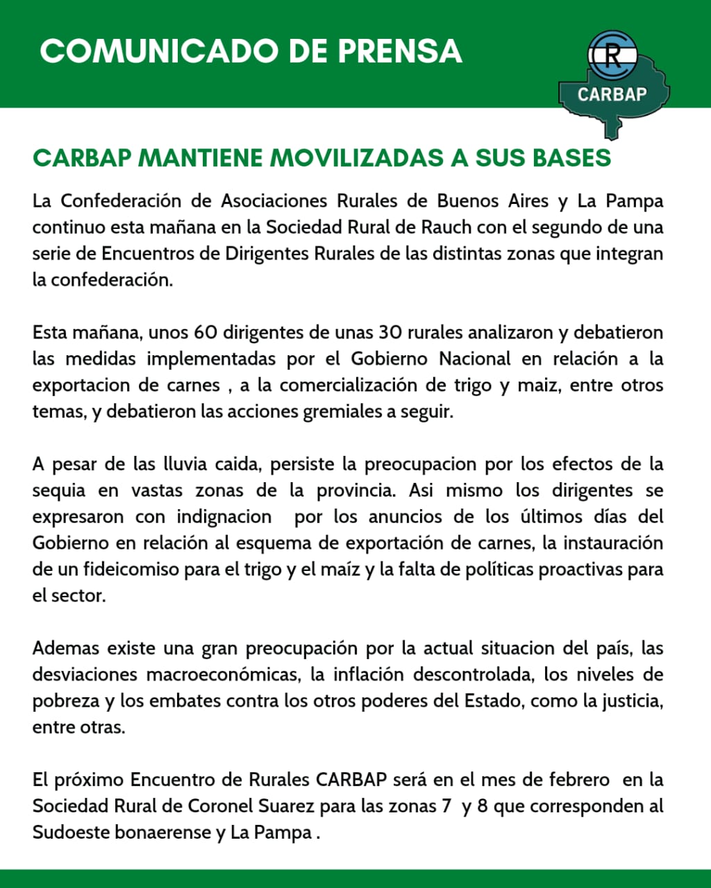 En medio de un contexto de gran preocupación en el sector por los efectos de la sequía y por la falta de políticas hacia el sector, dirigentes de entidades rurales agrupadas en la Confederación de Asociaciones Rurales de Buenos Aires y La Pampa (Carbap) se reunieron para evaluar y debatir las últimas decisiones del Gobierno y definir cuáles serán las acciones gremiales a seguir. No descartan medidas de fuerza, aunque aún resta que se realice otra asamblea para definir el curso de acción.