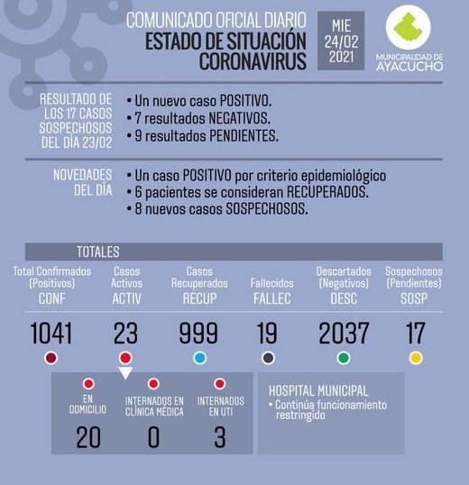 Teniendo en cuenta que hubo 6 pacientes recuperados, el número de activos sigue descendiendo llegando a 23. De ese total, 3 se encuentran internados en el Hospital Municipal en Sala de Cuidados Intensivos.