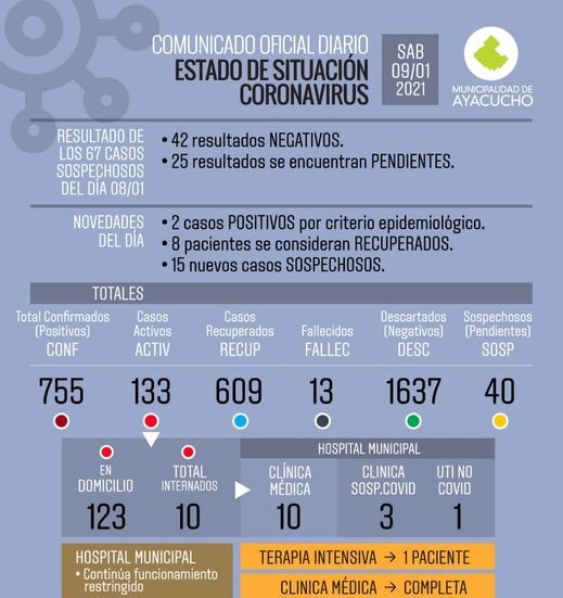 Es importante mencionar que 8 pacientes cumplieron el plazo de recuperación. En total, hay en Ayacucho 133 casos activos de los cuales 10 están internados. En UTI solo hay un paciente pero que no es por Covid.