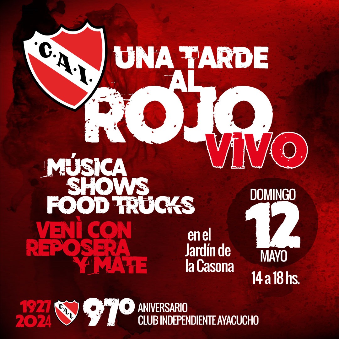 La Comisión Directiva del Club Independiente confirmó la fecha en la que realizarán los festejos por los 97 años de la institución. Será el domingo 12 de Mayo en lo que han denominado llamar “Una tarde al rojo vivo”, con música, shows, food truck, y mucho más. Será de 14 a 18 horas en el jardín de la Casona.
