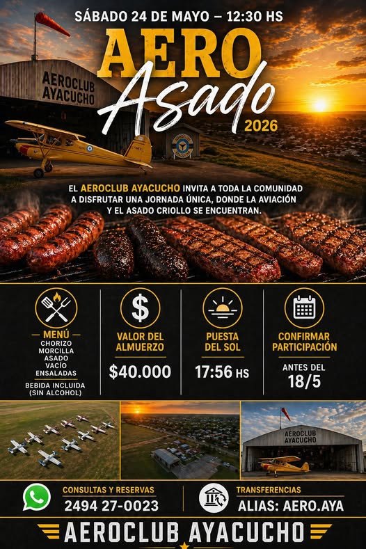 El Aero Club prepara un Gran asado para el 24 de Mayo – Pedí tu tarjeta al 2494-270023 27 abril, 2026 Pablo Tusq destacados, Locales, locales DIA 0 El Aeroclub Ayacucho invita a la comunidad aeronáutica a compartir un rico asado el 24 de Mayo. Los esperamos. X