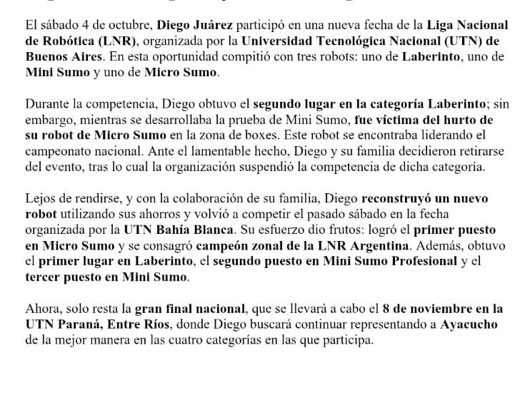 El ayacuchense Diego Juárez se consagró campeón zonal de la Liga de Robótica 22 octubre, 2025 Pablo Tusq destacados, Locales, locales DIA 0 X