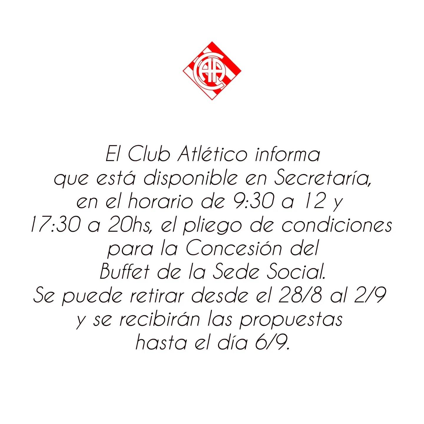 El Club Atlético informa por este medio que está disponible en Secretaría, en el horario de 9:30 a 12 y 17:30 a 20 hs, el pliego de condiciones para la Concesión del Buffet de la Sede Social. Se recibirán las propuestas hasta este viernes 6/9.