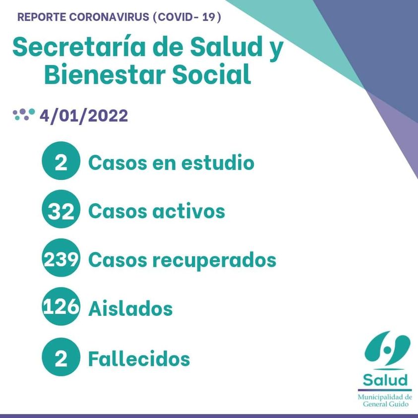 Cuarto día del año y se registran 112 casos activos de Coronavirus. Son 24 casos mas que los anunciados el lunes 3 de enero. El informe dice que hay 8 casos en estudio, mientras que ascendieron notablemente la cantidad de vecinos aislados de 396 a 457. Los recuperados son 1051.