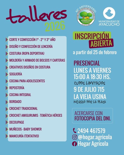 El Hogar Agrícola «Rosario Vera Peñaloza «, invita a inscribirse en sus talleres para 2026 26 febrero, 2026 Pablo Tusq Locales, locales DIA 0 ¡¡Atención!! Comienzan las inscripciones a los talleres. Los esperamos a partir de las 15; X