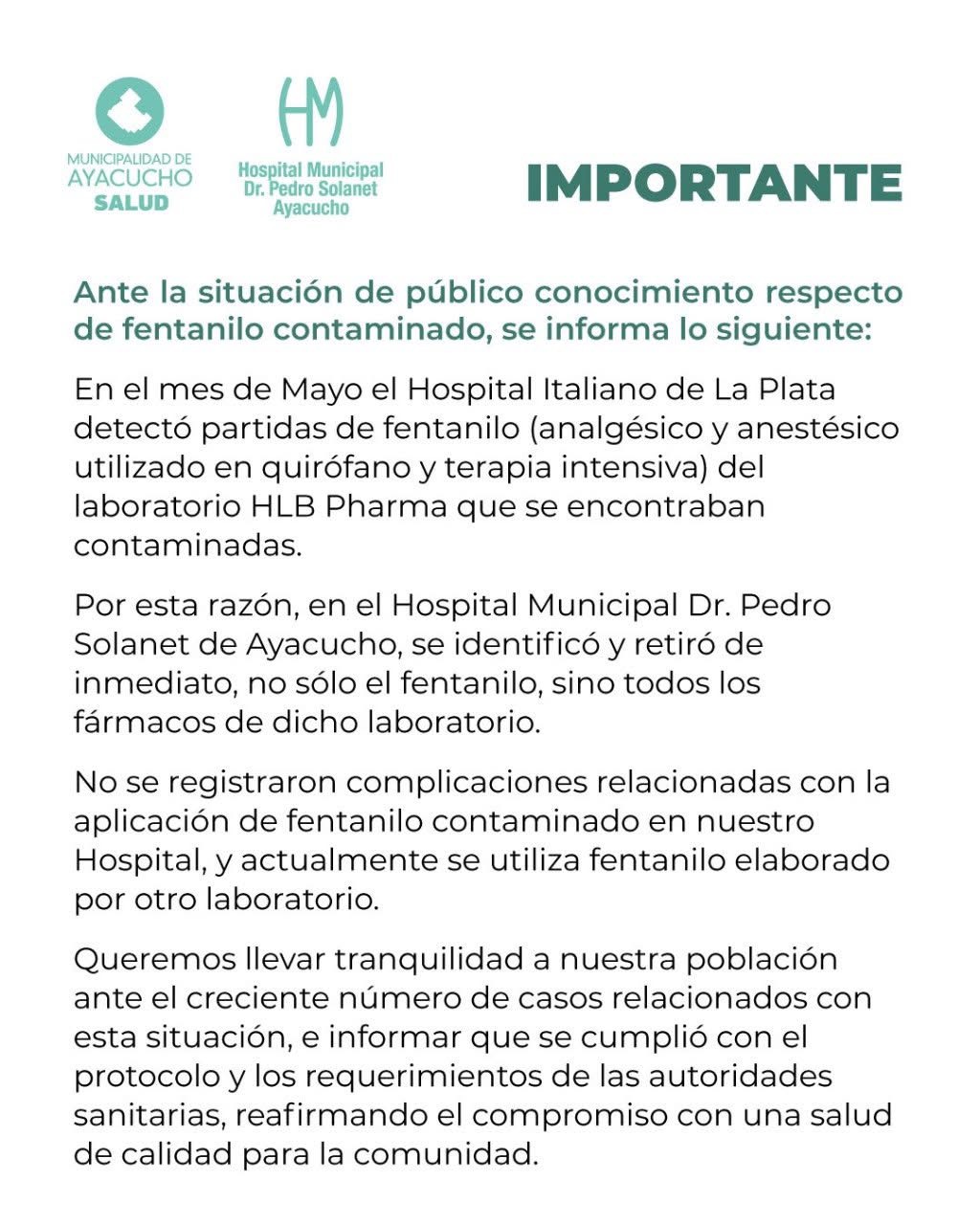 Ante una situación que no solo genera alarma y preocupación por el fentanilo en mal estado que lleva casi 100 víctimas fatales en el país, la dirección del Hospital Municipal tomó la determinación de retirar dosis de fentanilo y demás drogas que se habían adquirido al laboratorio HLB Pharma.