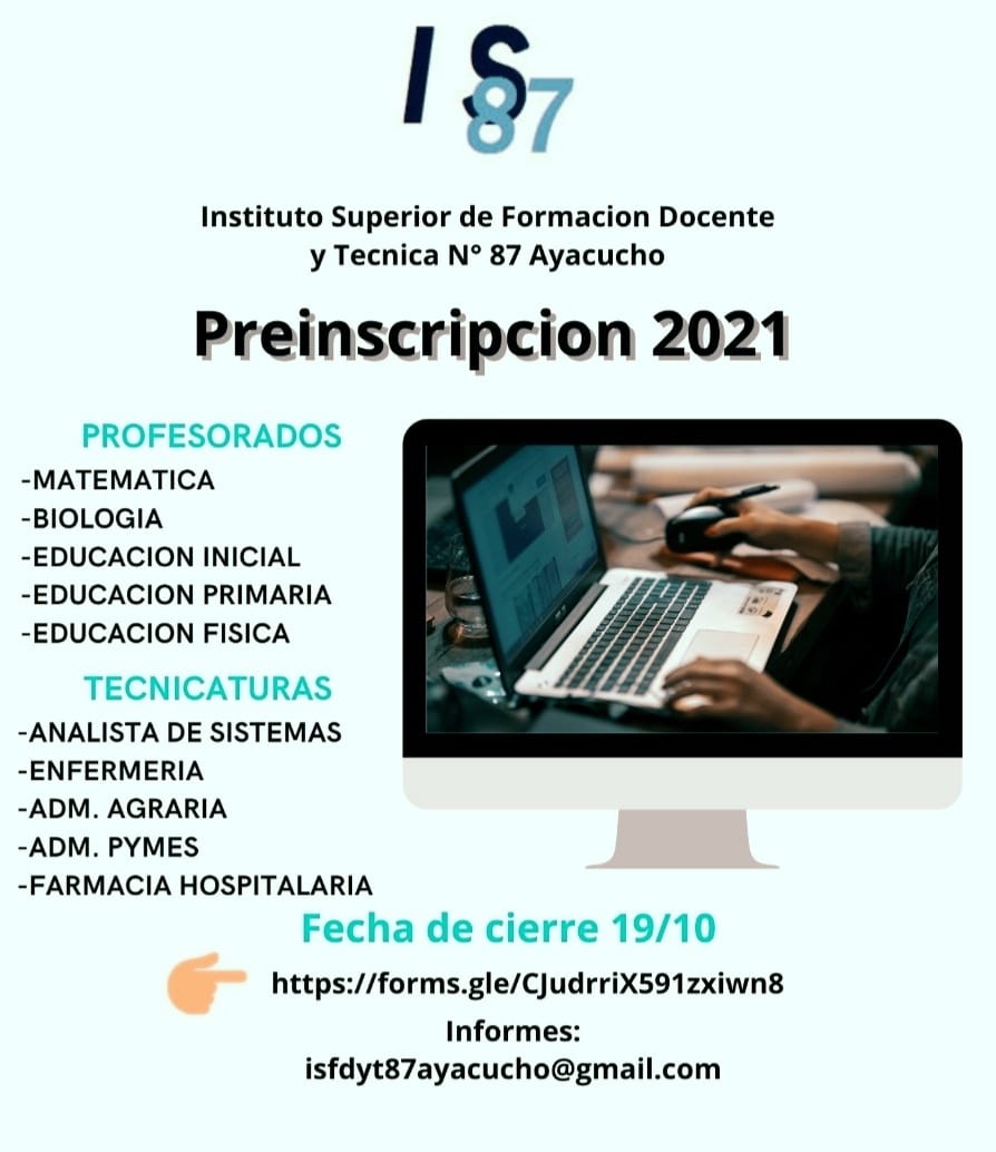 El instituto Superior de Formación Docente y Técnica Nº87 envió el enlace en donde los interesados podrán realizar la preinscripción a las carreras que constituirán la oferta educativa 2021, y que estará disponible hasta el día 19 de Octubre.