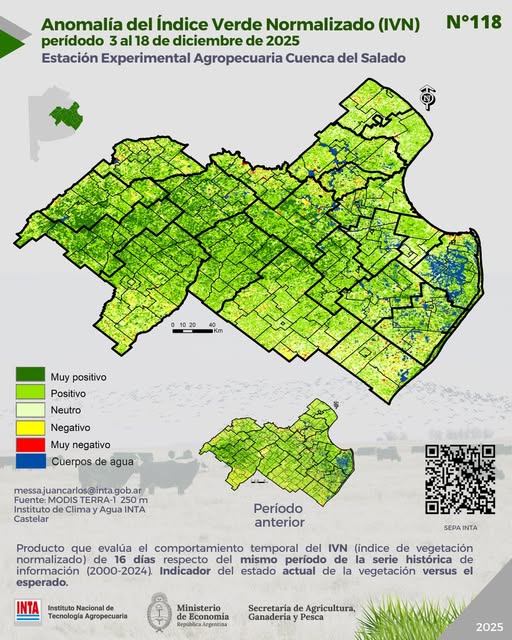El INTA hizo público un informe sobre el «Estado de la vegetación» 29 diciembre, 2025 Pablo Tusq Campo, campo DIA, destacados 0 Estado de la vegetación Con datos satelitales MODIS de INTA Castelar. EEA Cuenca del Salado mapa de anomalías de IVN, que muestra el comportamiento temporal de la vegetación basado en el índice de vegetación normalizado. Valores positivos = más crecimiento de lo esperado. Valores negativos = menor actividad o estrés. Estado de la vegetaciónINTA Cuenca del Salado X