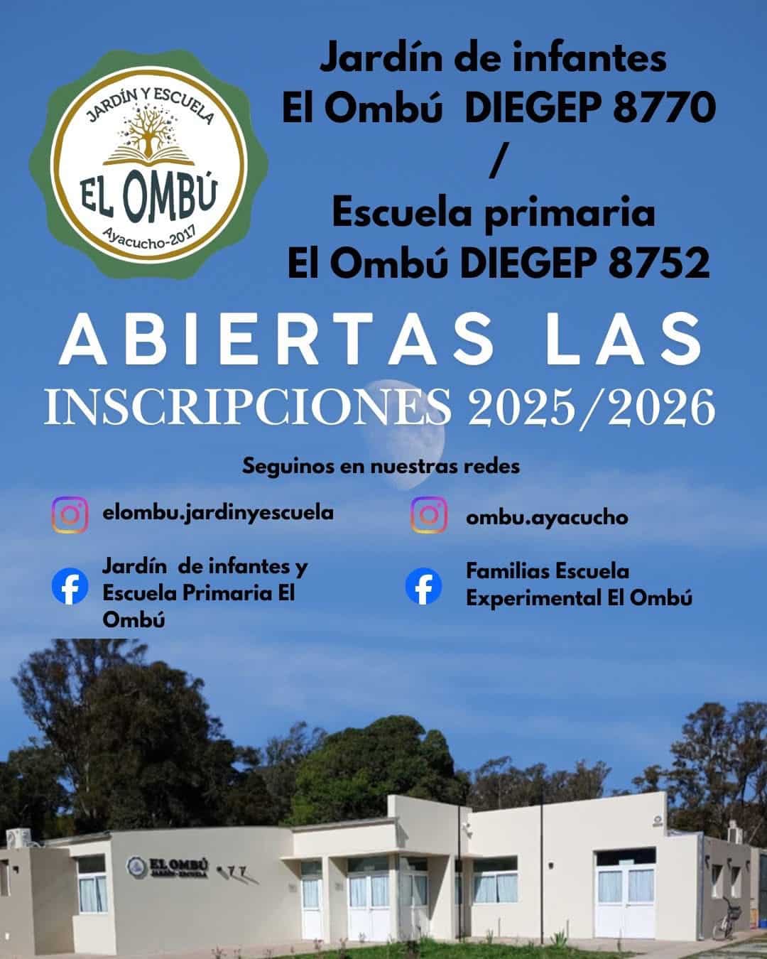 El Jardín de Infantes “El Ombú” como su Escuela Primaria, tienen abiertas las inscripciones para el Ciclo Lectivo 2026. Esta propuesta pedagógica en franco crecimiento y que cuenta desde hace un año con edificio propio en la Chacra Municipal, invita a todos los papás que quieran anotar a sus hijos, a que se dirijan directamente al establecimiento, a conocer las bondades del lugar como también en qué consiste el proyecto.