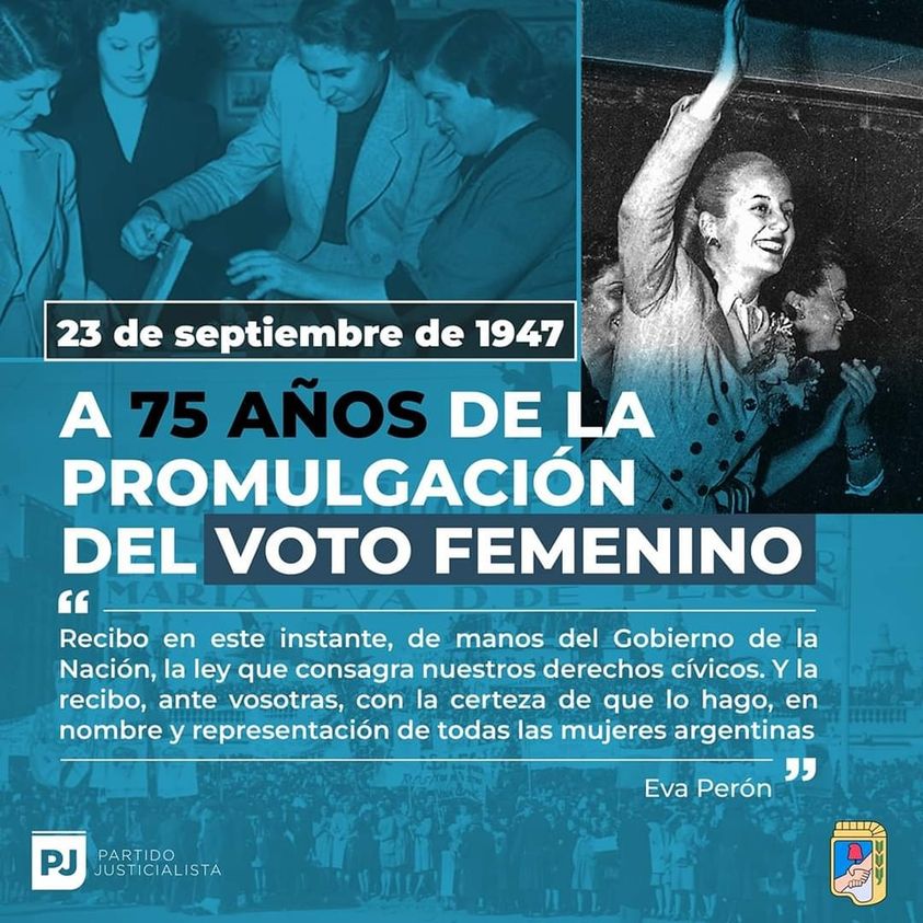 Desde el PJ local recordaron que «hoy viernes 23 de septiembre, se cumplen 75 años donde las mujeres argentinas daban un enorme paso en la lucha por sus derechos políticos, con la promulgación de la “Ley Evita” que les reconocía su derecho a votar y a ser elegidas.