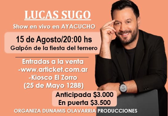 Luego de saludarnos e intercambiar los primeros conceptos, señala; «Gracias por esta oportunidad, estamos muy contentos de poder traer semejante artista acá a esta ciudad. Lucas y su representante me pidieron que elija una ciudad linda cerca de Mar del Plata para presentarse, y en lo primero que pensé fue en Ayacucho. Si bien no conocía la ciudad, me pareció interesante, así como el recibimiento de la gente que cuando camino en estas calles y le pregunto, se muestran entusiasmado con esta posibilidad».