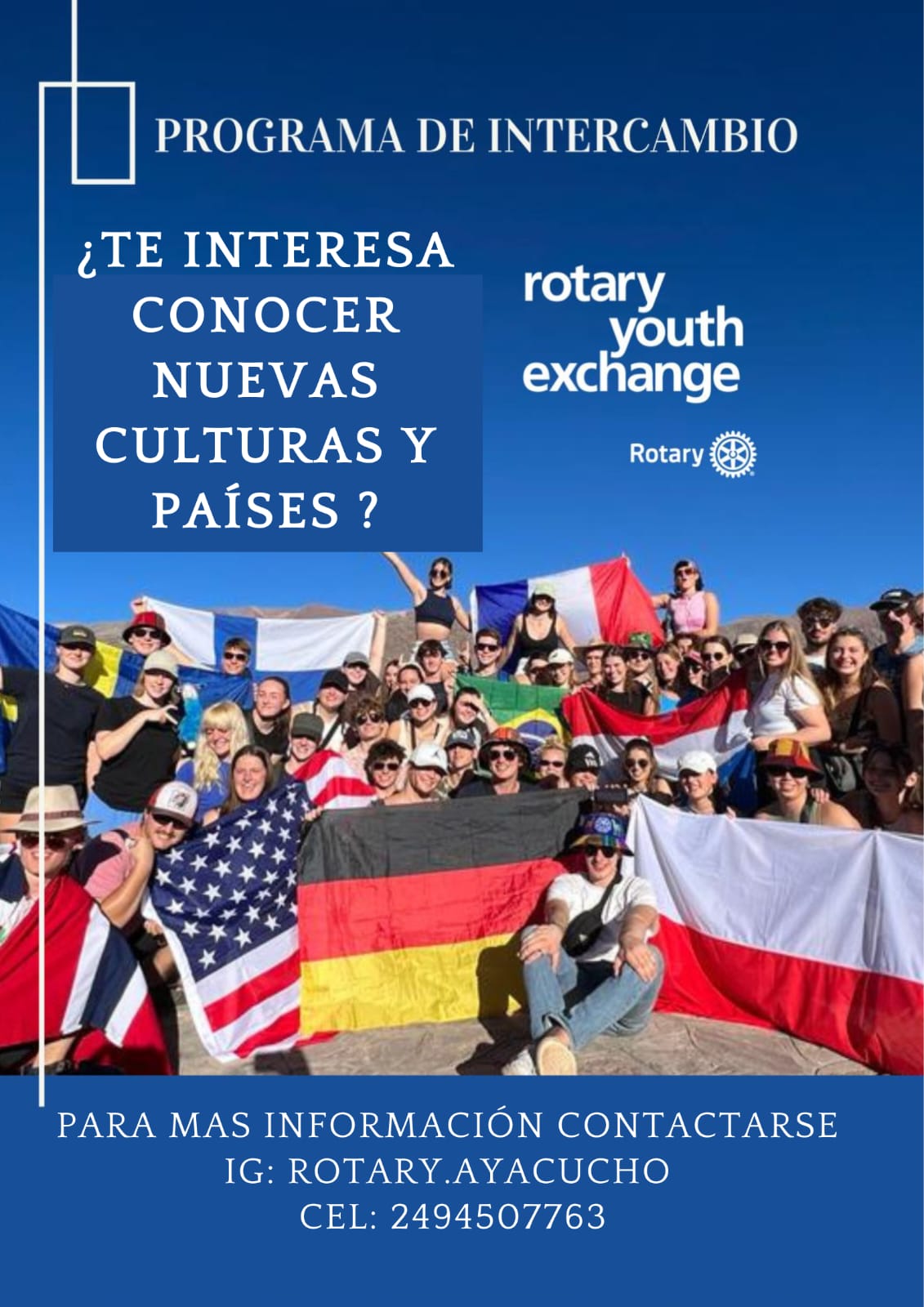 El Rotary Club Ayacucho te invita a sumarte al programa de intercambio. Si te interesa conocer nuevas culturas y países, el Rotary te propone incorporarte al Rotary Youth Exchange. Para más información comunciarte al 2494 – 507763 o en IG Rotary.Ayacucho