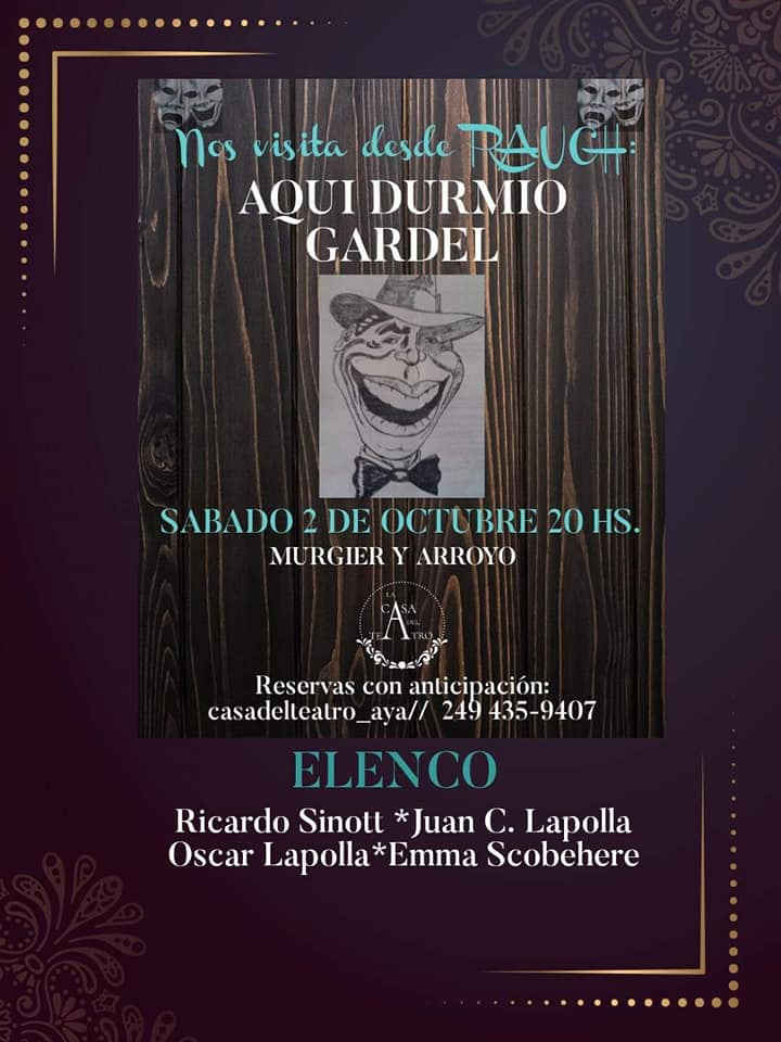 Como resúmen la Casa del teatro compartió; pasó «AQUI DURMIO GARDEL» de nuestros Amigos de RAUCH del Teatro Candilejas, felices de recibirlos!! Con una puesta en escena maravillosa a cargo de Juan Carlos Lapolla y actuaciones impecables Oscar Lapolla, Emma Scobehere, Juan Carlos Lapolla, Ricardo Sinott en el bandoneón mágico!!! En la técnica Marcelo Robles y Ezequiel Lapolla. Fotogafia Daniel Franchino.