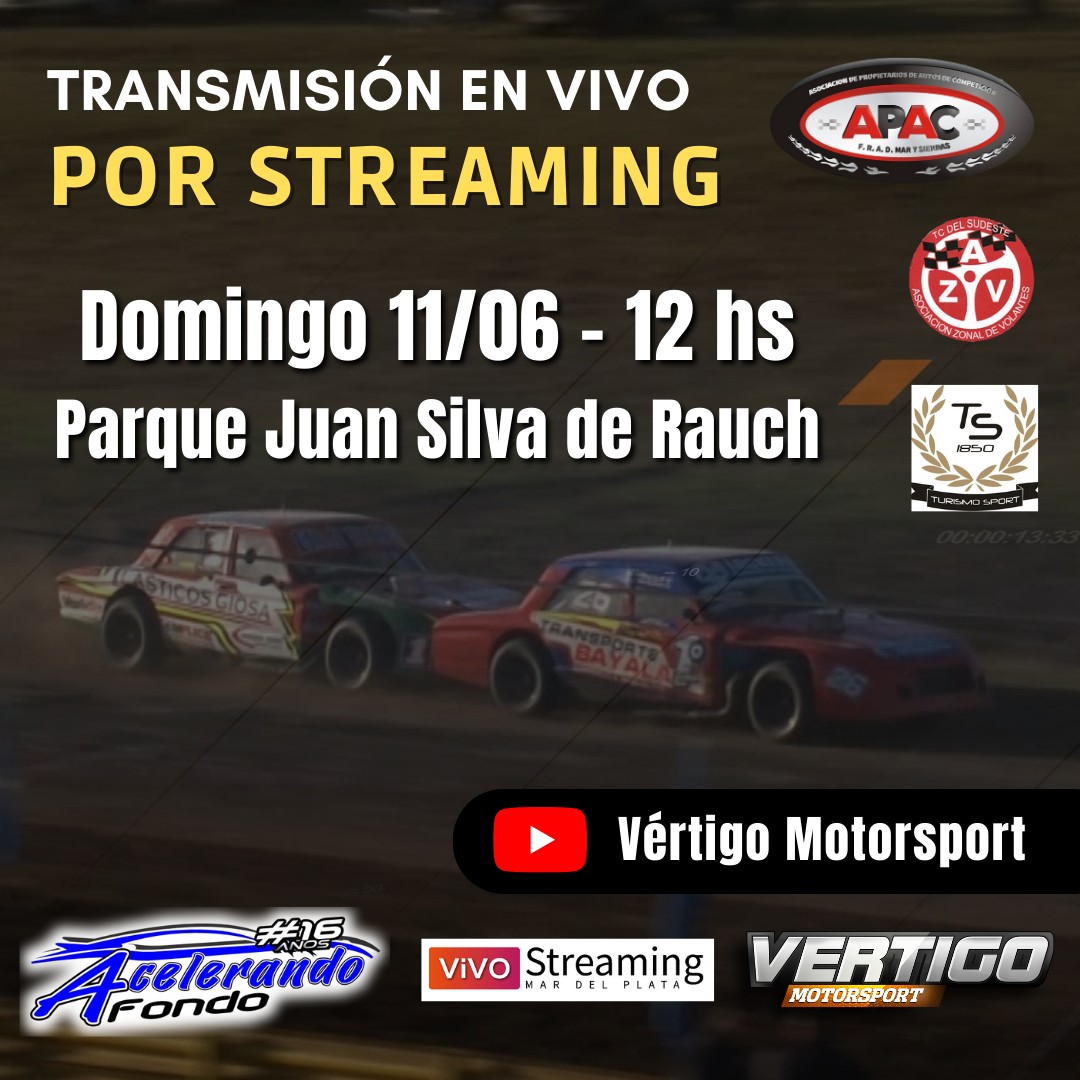 El domingo 11 de junio desde las 12 hs, junto al equipo Acelerando a Fondo y Vivo Streaming Mar del Plata, transmitimos en vivo la tercera fecha de APAC, Turismo Sport 1850 y TC del Sudeste, en el circuito ‘Martín Fierro’ rauchense.