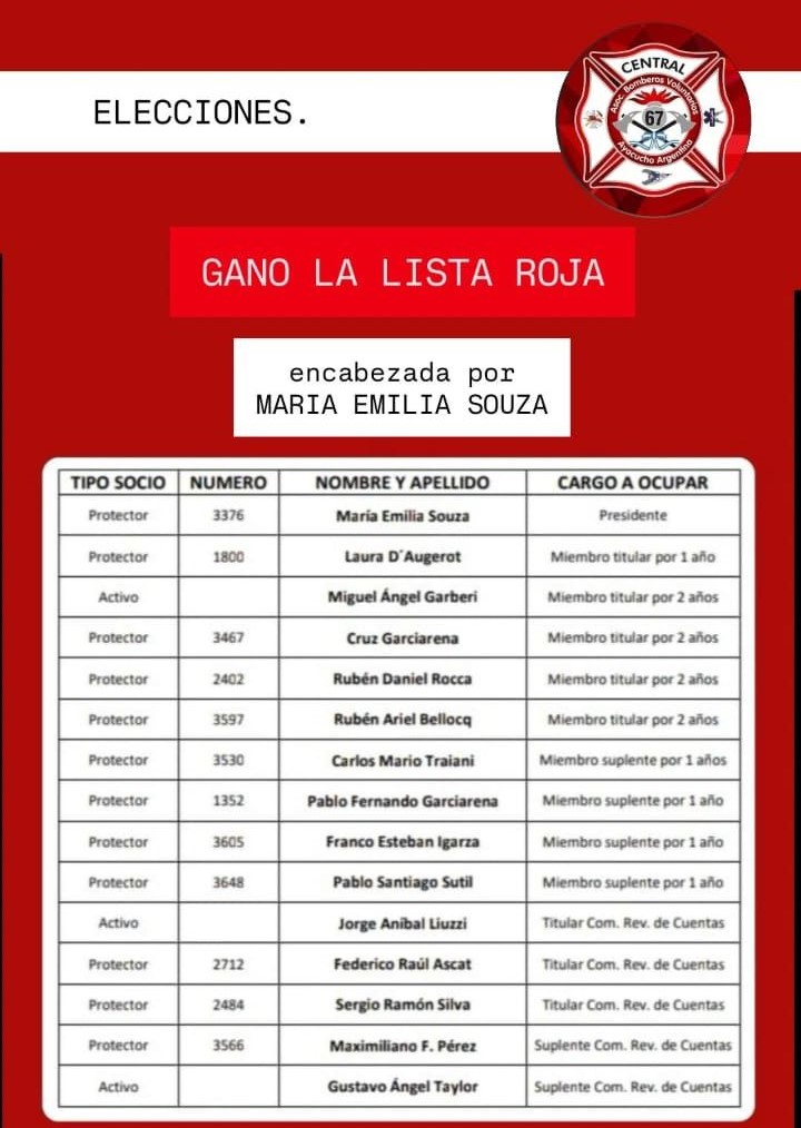 Emilia Souza, quien encabezaba la Lista Roja, seguirá siendo la Presidenta de la Asociación Civil Bomberos Voluntarios, luego de las elecciones que se desarrollaron en la noche de este lunes 31 de marzo, ante más de 500 socios que acudieron a elegir a sus autoridades.