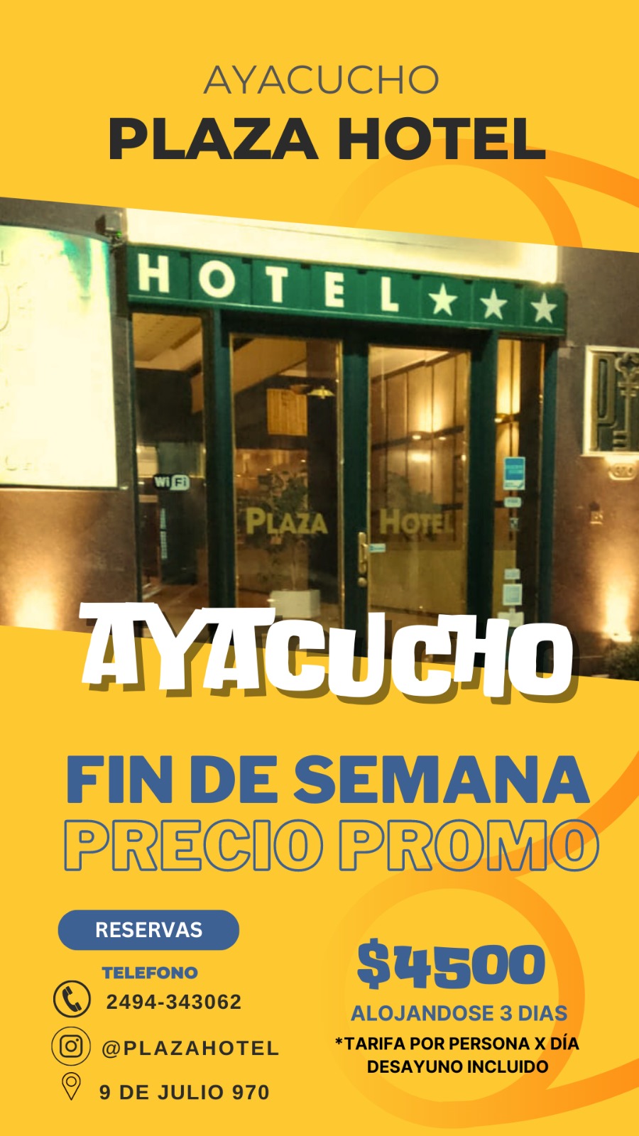 Nos pueden encontrar en las redes como @plazahotelayacucho en Instagram, en facebook. También nos encuentran en la pagina como Plaza Hotel Ayacucho, vía mail plazahotelayacucho2022@gmail.com, al celular 2494-343062, al tel fijo (02296) 45-2300.
