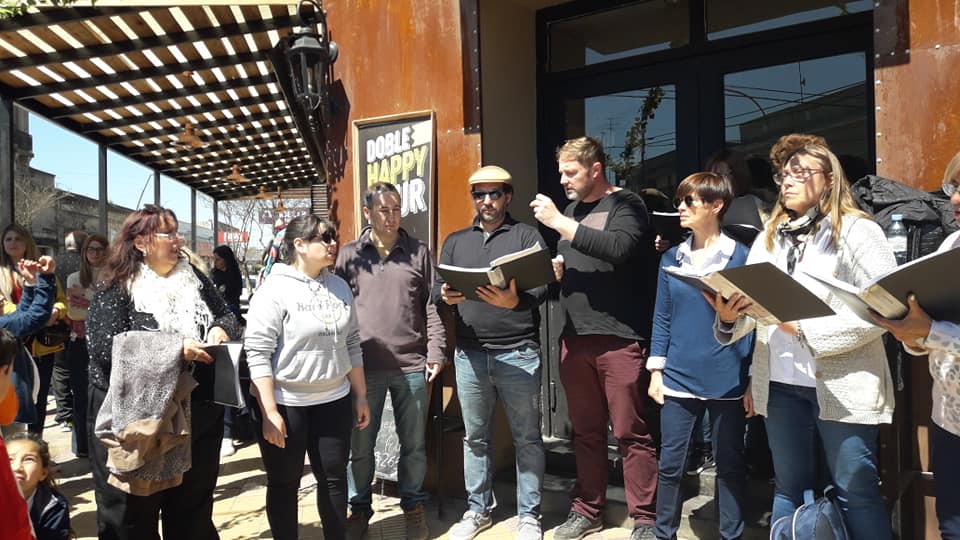 Alrededor de las 11,30 en la Plaza San Martín en una jornada a pleno sol, se realizó una Cantata Callejera, con la actuación de distintas agrupaciones y, de la que también se sumaron vecinos de la ciudad. Los coros que estuvieron presentes fueron el Coro de Niños y Adolescentes de la EMEAI dirigido por Emilia Cano con la asistencia de Dolores Racioppi; el Coro de Adultos de la EMEAI que es dirigido por Fernanda Lalloz con asistencia de Sergio Rodríguez; el Coro Polifónico de Castelli dirigido por Andrés Bourras; el Taller de Ensamble de la ciudad de Maipú dirigido por Sebastián Fernández Cerri; el Coro de Niños y Adultos del Colegio San Francisco de Asis de Villa Elisa, dirigido por Valentina Guerrero y Constanza Finochi; y el Coro “Voces del Agua” del Sindicato de Obras Sanitarias de La Plata, dirigido por Guillermo Massi y Valentina Guerrero y la Preparación Vocal de Sonia Stelman.