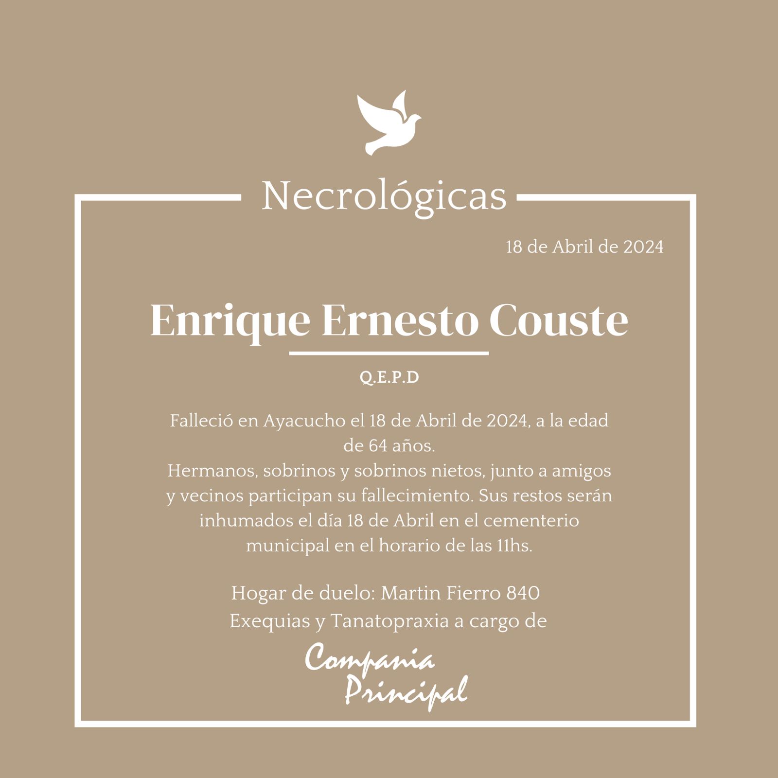 Falleció en nuestra ciudad el jueves 18 de Abril a la edad de 64 años, Enrique Ernesto Cousté. Sus hermanos, sobrinos y sobrinos nietos, junto a amigos y vecinos participaron de su fallecimiento. Sus restos han sido inhumados en el Cementerio Municipal a las 11 horas. Hogar de duelo: Martín Fierro 840.