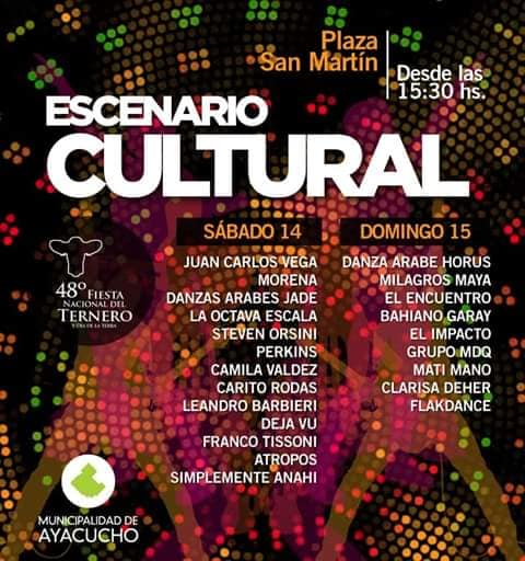 Impulsada desde la Dirección de Cultura de la Municipalidad de Ayacucho, este sábado y domingo desde las 15-30 hs en Plaza San Martín, se contará con una atractiva propuesta que ha sido denominada «Escenario Cultural», en adhesión a la 48° Fiesta Nacional del ternero y Día de la Yerra.