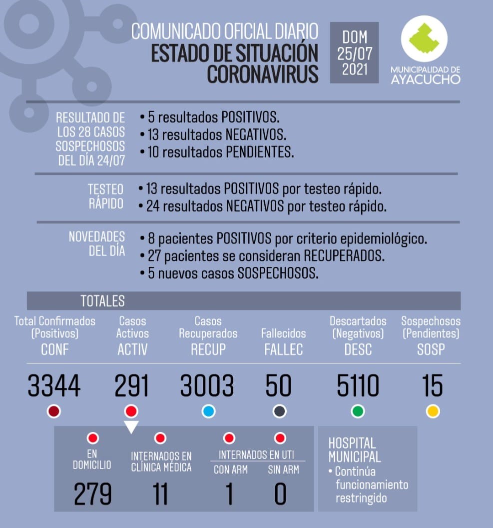 Con una diferencia mínima, bajaron los activos de Covid en Ayacucho. En las últimas 24 horas se registraron 26 nuevos positivos y 27 recuperados. Con estas cifras, los activos son 291. De ese total, 12 personas están internadas en el Hospital Municipal: 11 en clínica médica y 1 en UTI con asistencia respiratoria.