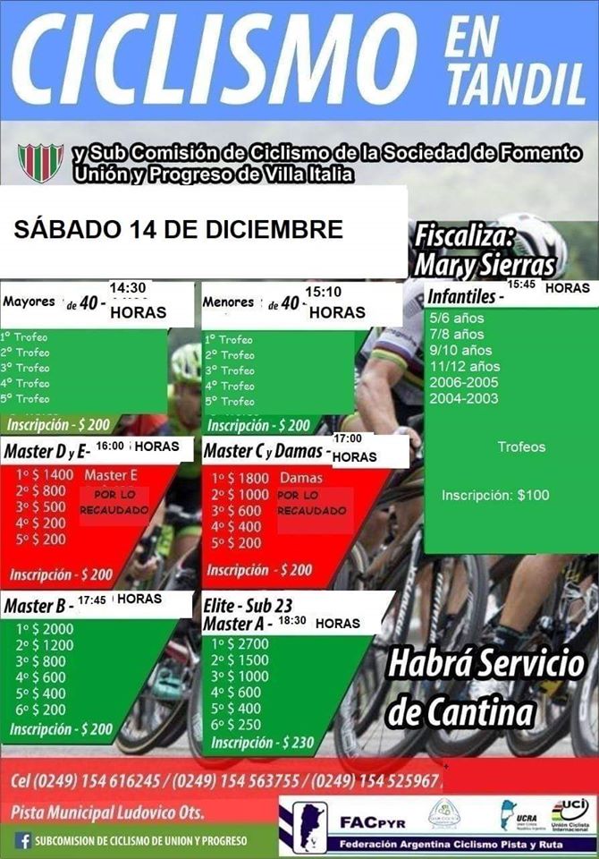 Este sábado habrá Ciclismo en la Pista «Ludovico Ots» de la ciudad serrana. Organiza subcomisión de Unión y Progreso, fiscaliza la asociación Mar y Sierras. Se anuncia servicio de cantina.