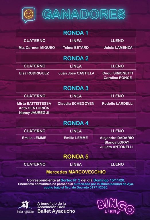 Rotundo éxito tuvo el Bingo Libre a beneficio de la Asociación Civil Ballet Ayacucho, concretado el pasado domingo 15 de Noviembre, y que entregó más de 50 mil pesos en premios. La gran ganadora de la notable propuesta fue Mercedes Marcovecchio, quien se llevó 34 mil pesos producto de haberse quedado con el Terno, la Línea y el Cartón lleno de la última ronda. La próxima edición será el domingo 13 de Diciembre a beneficio de la Media Caña.