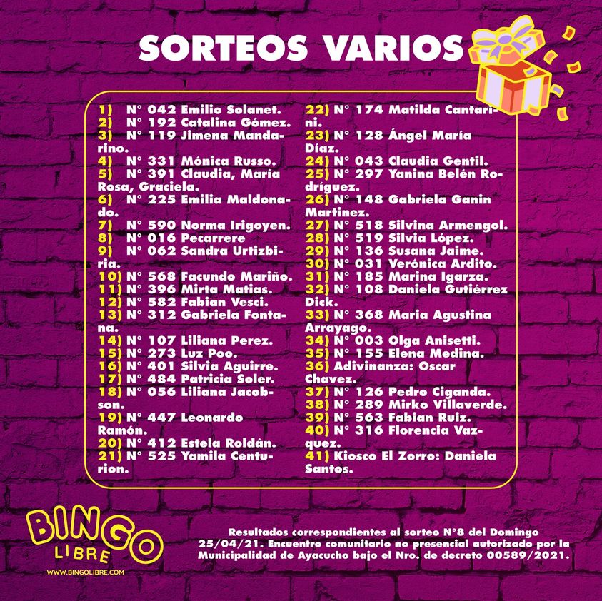 Este domingo 25 se concretó una nueva edición del Bingo Libre a beneficio del Colegio Nuestra Señora de la Purificación, el cual entregó más de 50 mil pesos. El ganador del cartón lleno en la ronda final fue Oscar Tomasso que se llevó $22 mil pesos. La próxima edición será el 9 de Mayo a beneficio del Centro Vasco Euskal Odola.