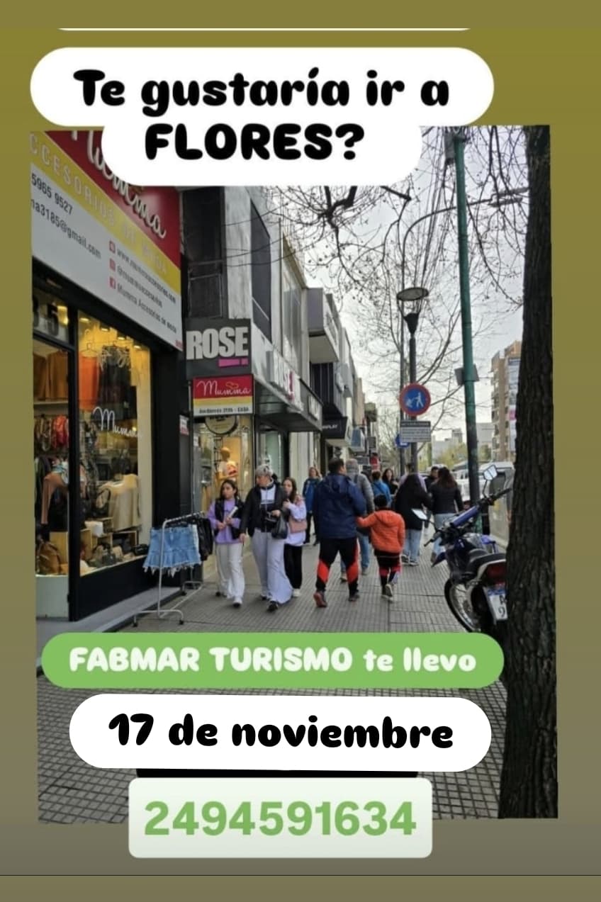 FAB MAR Turismo vuelve a Flores, al principal centro comercial de Buenos Aires. Será el venidero Lunes 17 de Noviembre. Consultá con Marisa al 2494 591634 o en las redes de FAB MAR Turismo.