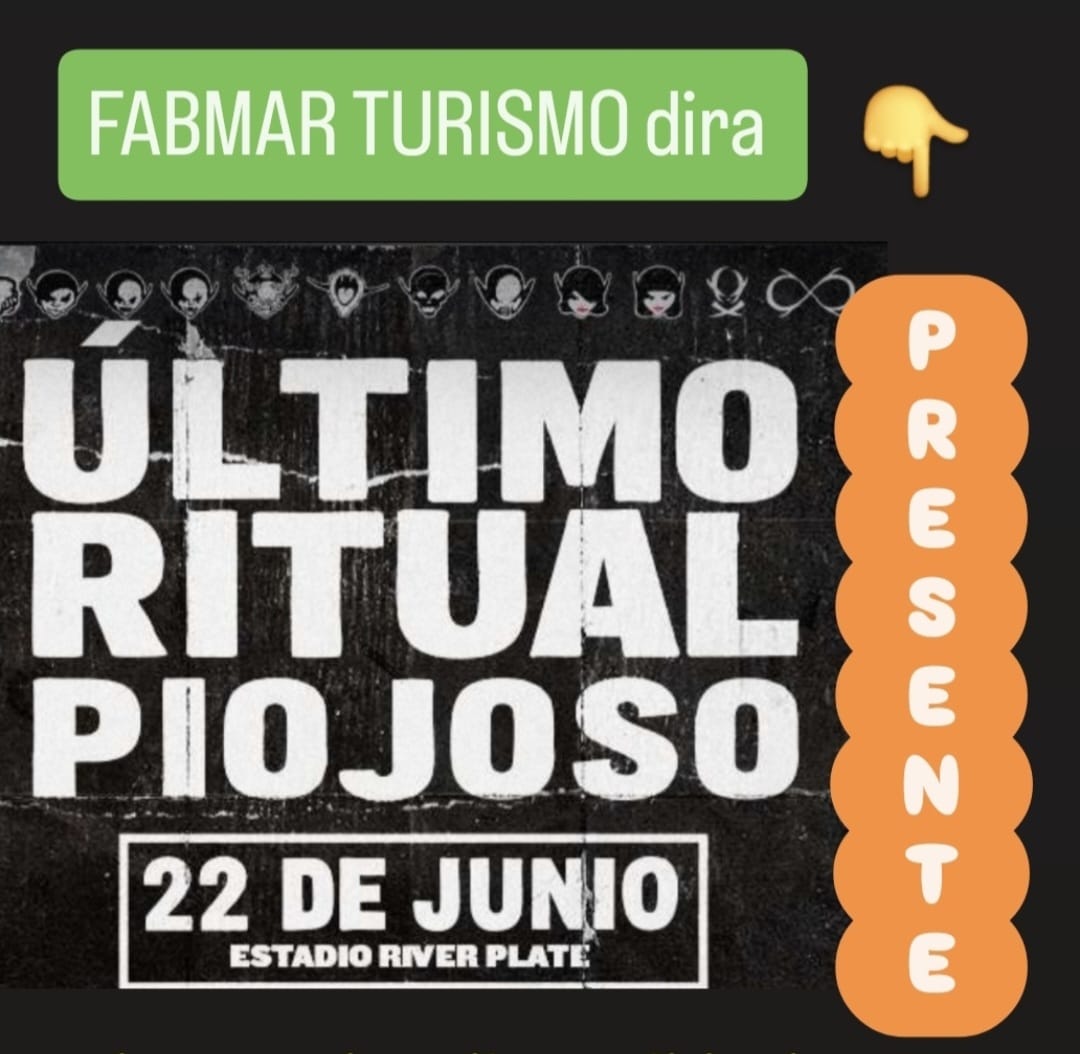 FAB MAR Turismo te lleva al “Ultimo Ritual Piojoso”, en cancha de River, este domingo 22 de Junio, tengas o no entrada. Consultá con Marisa al 2494 591634 o a través de las redes sociales.