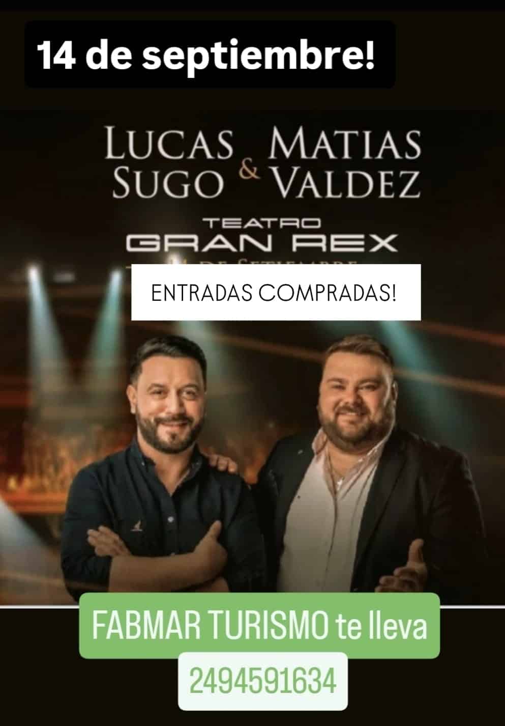 FAB MAR Turismo te lleva el venidero domingo 14 de septiembre al imperdible show de Lucas Sugo y Matías Valdéz, en el Teatro Gran Rex de Buenos Aires. Ya tenemos las entradas compradas. Contactá a Marisa al 2494 591634 o en redes.