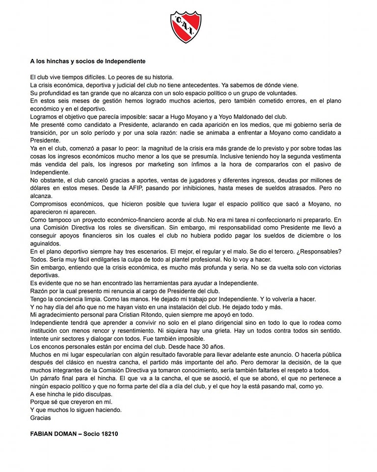 Fabian Doman presentó su renuncia a la presidencia de Independiente