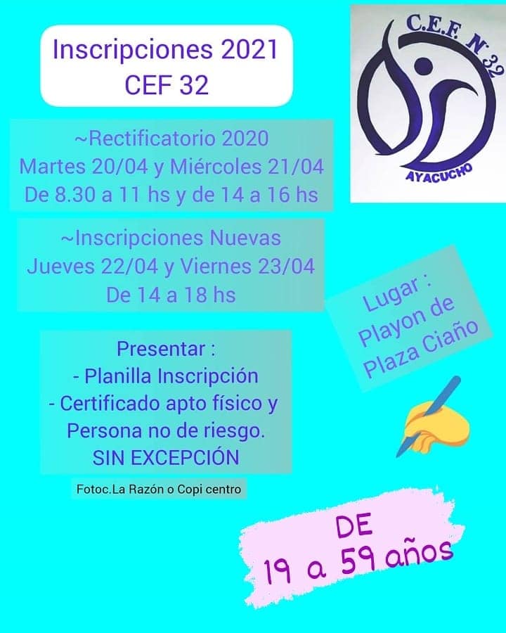 Por este medio se da a conocer las fechas de inscripción y propuestas para este año del CEF Nro 32. Por normativas recibidas y protocolos, las personas que se pueden anotar para las clases presenciales son las comprendidas entre 19 y 59 años de edad.