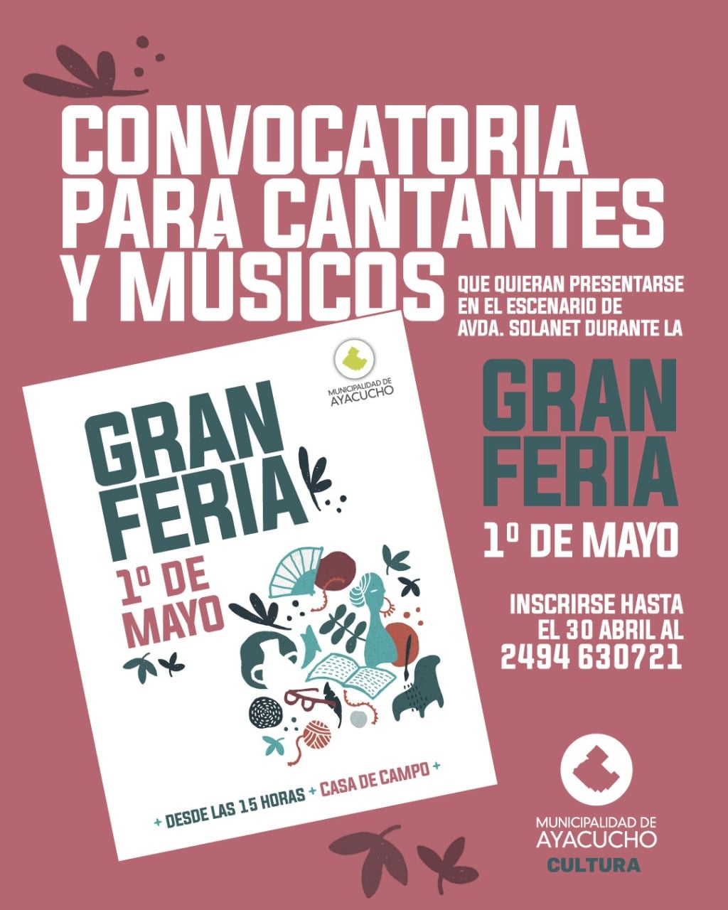 Desde la Dirección de Cultura de la Municipalidad, se invita a feriantes y artesanos locales, a participar de la gran feria del domingo 1° de mayo en el playón de la Casa de Campo.