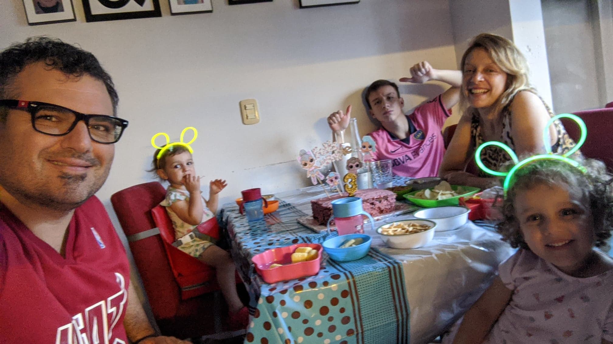 F. A; “En nuestro caso, el que más está en clases es Toto, cursando la secundaria, así que están con tareas y clases por zoom, y las niñas, como van a maternal, desde el jardín nos mandan videos de entretenimiento todos los días”.