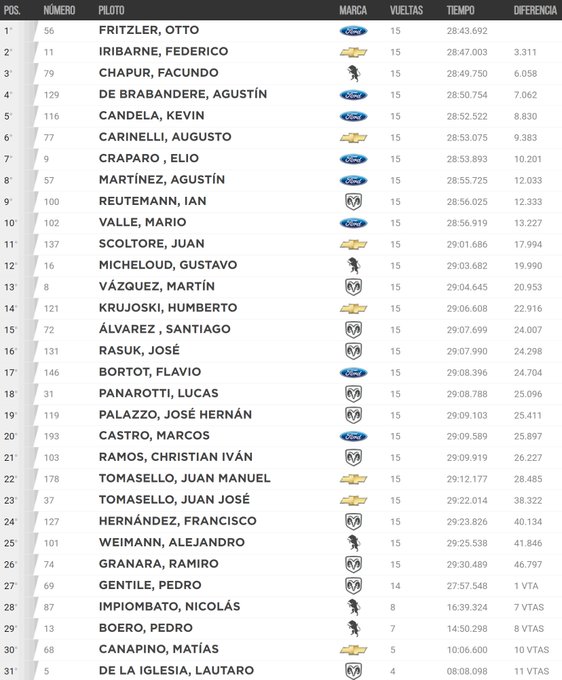 El grupo de los 10 de adelante de la telonera se completó con Agustín De Brabandere (Ford), Kevin Candela (Ford), Augusto Carinelli (Chevrolet), Elio Craparo (Ford), Agustín Martínez (Ford), Ian Reutemann (Dodge) y Mario Valle (Ford).