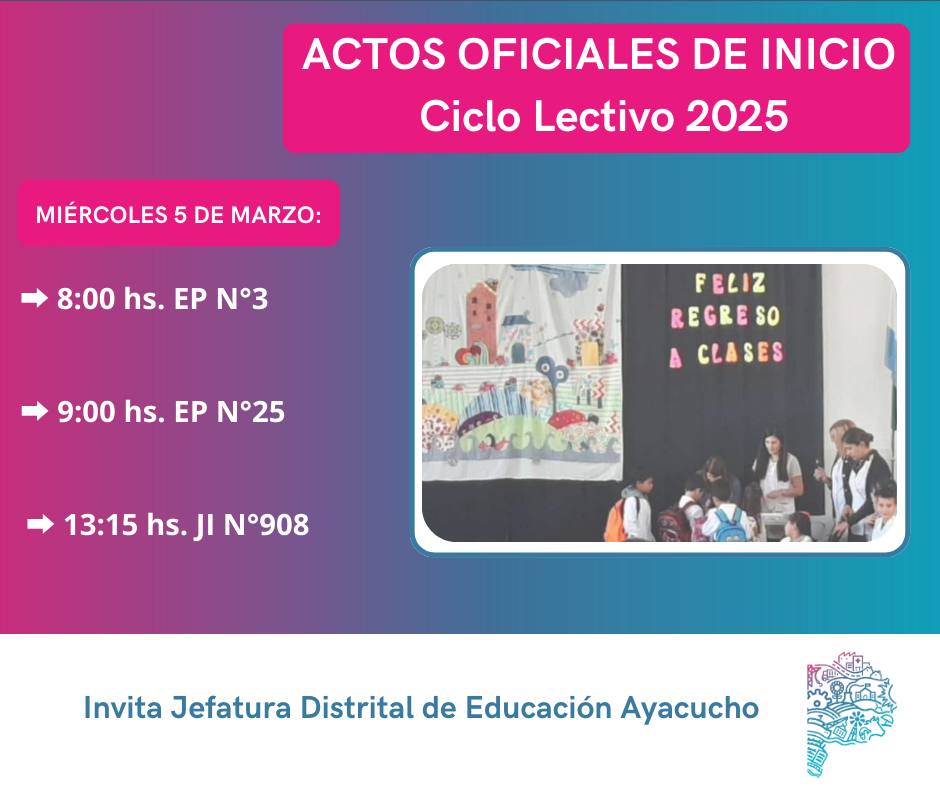 Este miércoles 5 de Marzo dio inicio el ciclo lectivo 2025 en Ayacucho, en los niveles inicial, primario y 1° año de secundaria, recordando que este año las clases se extenderán hasta el 22 de Diciembre, según detalla el calendario escolar provincial.