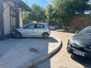 Este domingo alrededor de las 10 horas se produjo un fuerte choque entre dos autos, en la esquina céntrica de Rivadavia y San Martín. Como consecuencia del mismo, una mujer que conducía el Toyota Etios gris que terminó arriba de la vereda, fue llevada por precaución al Hospital Municipal.